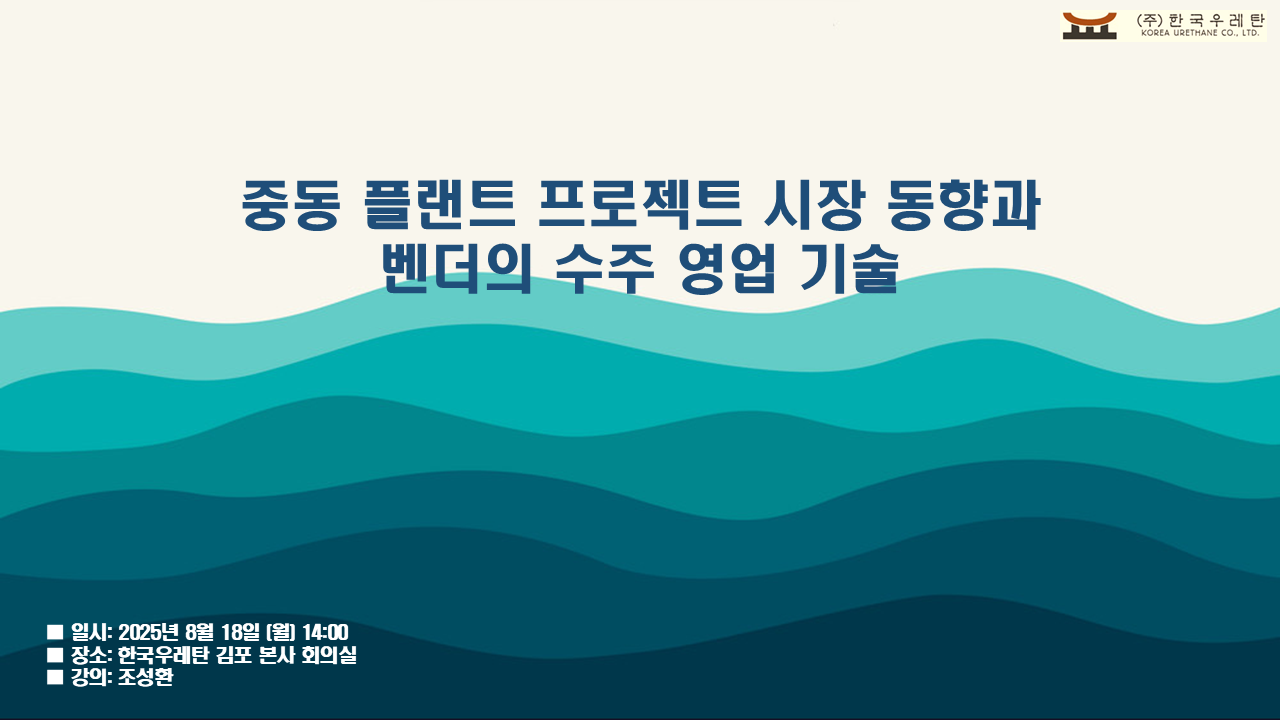 지난 8월 18일과 19일에 플랜트 기자재 업체의 요청으로 해외 수주 영업에 대한 강의가 있었습니다. 8월 18일(월)에는 김포의 한국우레탄㈜ 본사 회의실에서 “중동 플랜트 프로젝트 시장 동향과 벤더의 수주 영업 기술”이란 제목으로, 그리고 8월 19일(화)에는 ㈜파인테크닉스 안양 본사 회의실에서 “벤더의 플랜트 시장 신규 진출 전략”이란 제목으로 강의와 함께 질의응답이 진행되었습니다.