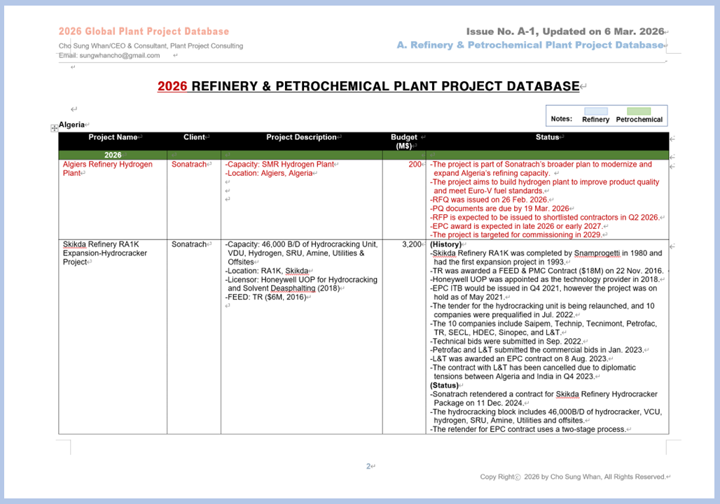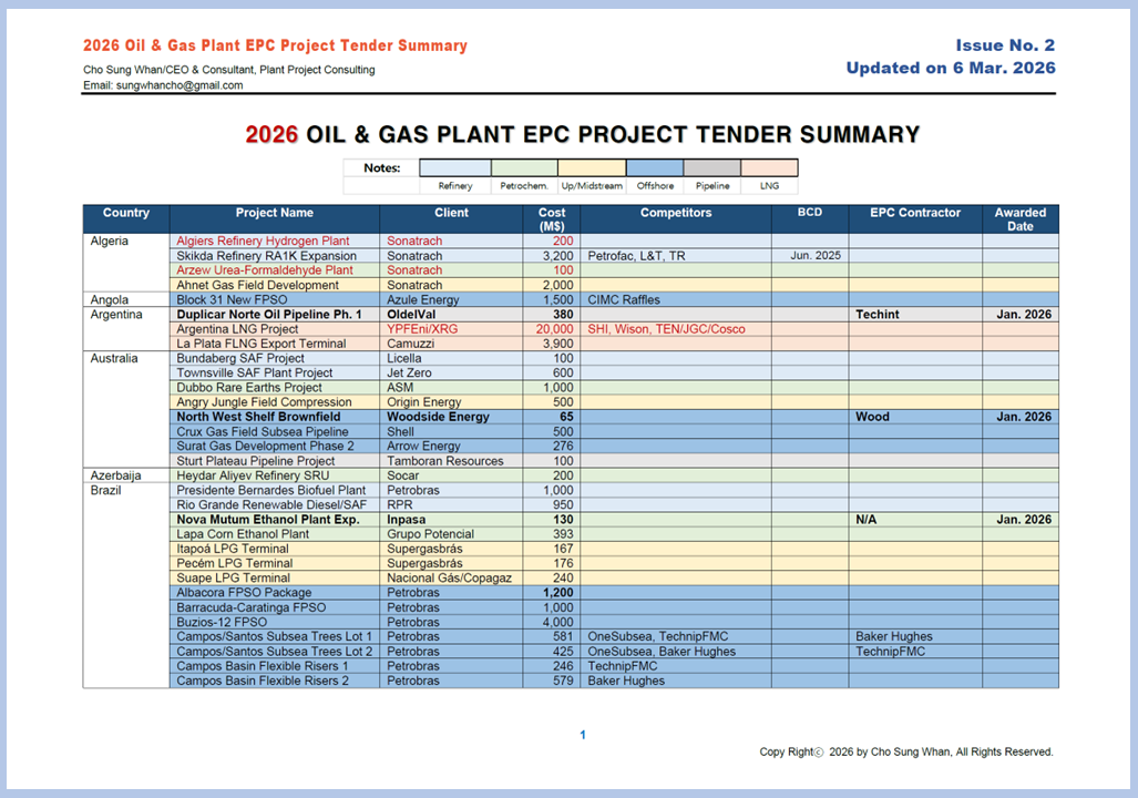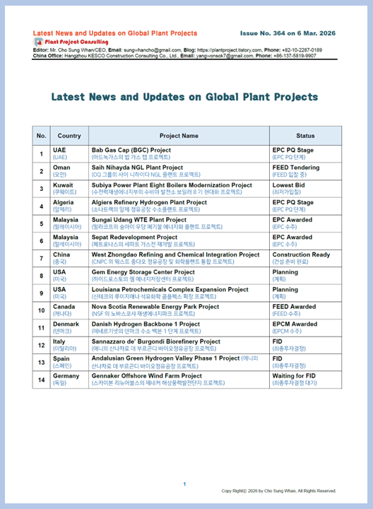 2026년 3월 6일자 "글로벌 플랜트 소식지 364호", 그리고 "Project Database"와 "Tender Summary"가 발간됐습니다. 목차와 자료들의 첫 페이지는 아래와 같습니다.